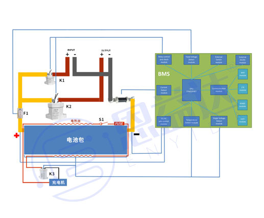 在重載工業車輛行業,車體需要較高電池容量,同時又要滿足更高的電壓平臺。電池又要兼顧車體的重量平衡作用,這種場景下需要將電池包分散在車體的四周。針對這種應用場景,我司開發了多電池包外部串聯方案。工作原理框圖如左圖:如需了解詳細內容,歡迎垂詢我們的技術人員。
