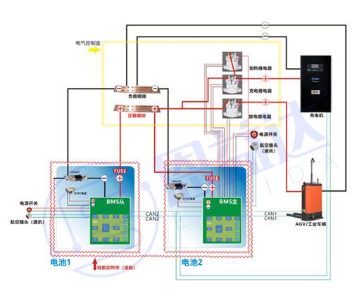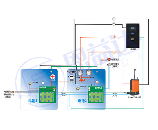 在某些特定工作場景中,工業車輛的設計空間要求緊湊,連續工作時間長。車體設計只能利用車上某幾不規則的空間放置電池包,且需要對稱放置來保證車輛的平衡。這對電池組的容量及外形尺寸的設計提出了更高要求,一個電池包已經無法滿足現場工況。針對這種特殊應用需求,我司給客戶定制開發了多電池包外部并聯方案。工作原理框圖如左圖:如需了解詳細內容,歡迎垂詢我們的技術人員。